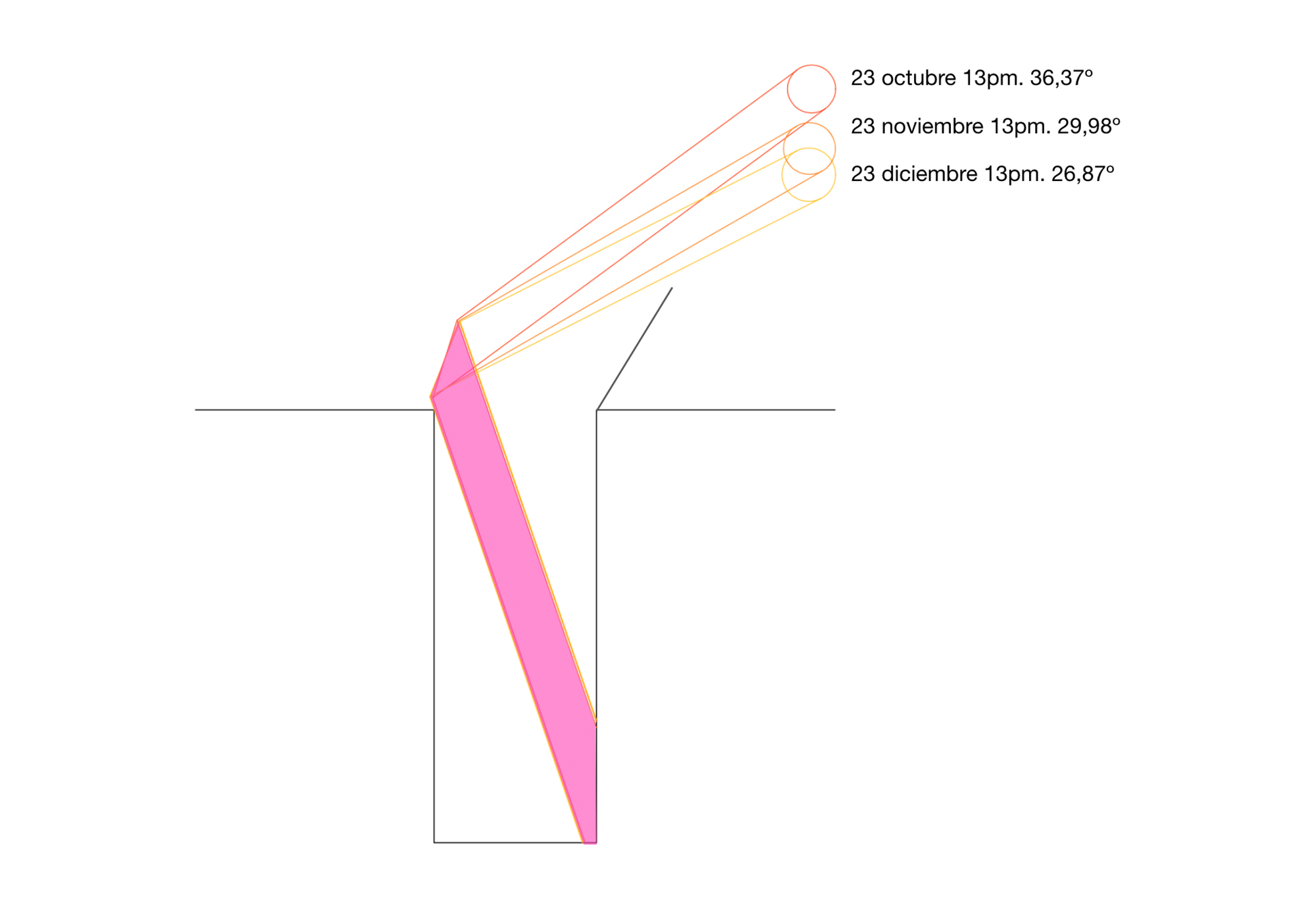 The intervention proposes an experience that questions the relationship between sunlight and architecture, and how a slight deviation from nature can alter the perception of the environment.
