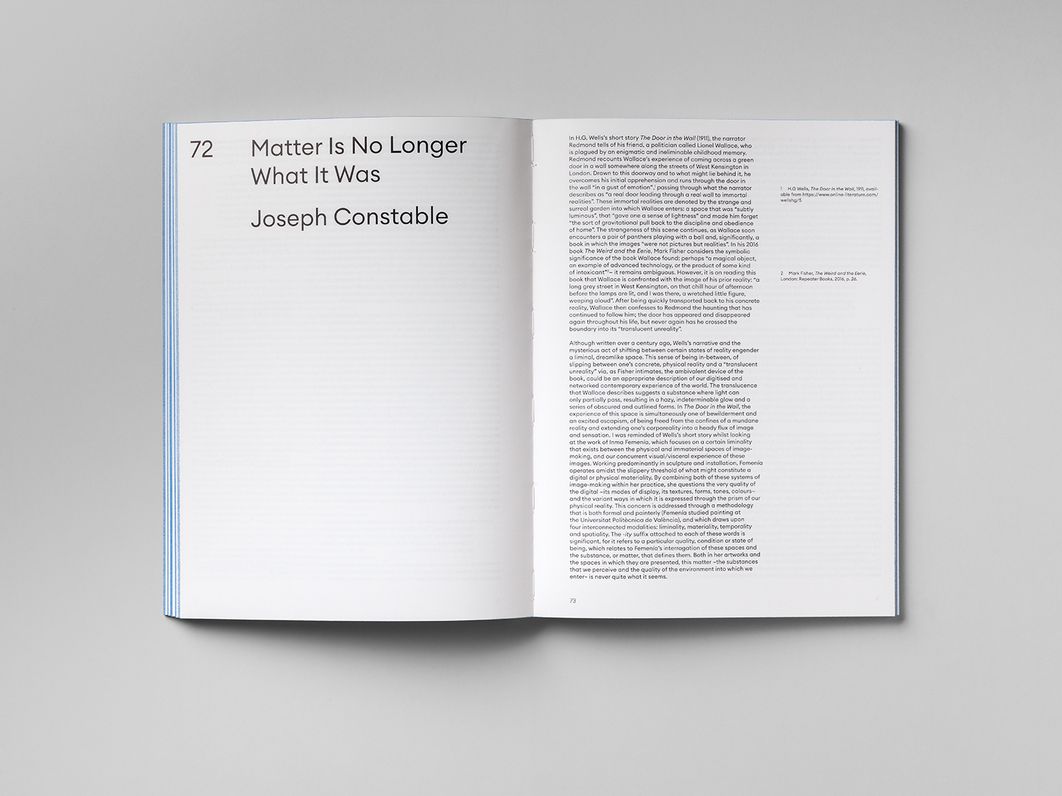 In Femenía’s work, light printing and the investigation of the materiality of digital technology are perfectly matched by her manipulation of materials. The light she extracts from the screens is no longer twodimensional; it has become an object, as well as a witness of an action carried out by the artist, which gives it both warmth and tension. In this exhibition the viewer is a key component, invited by Femenía to be part of the show as a body that walks and moves, turned into a participant in the act of perception, obliged to face her reflection in the simulated screens, her retina forced to make an effort and led to feel uneasy about the process.