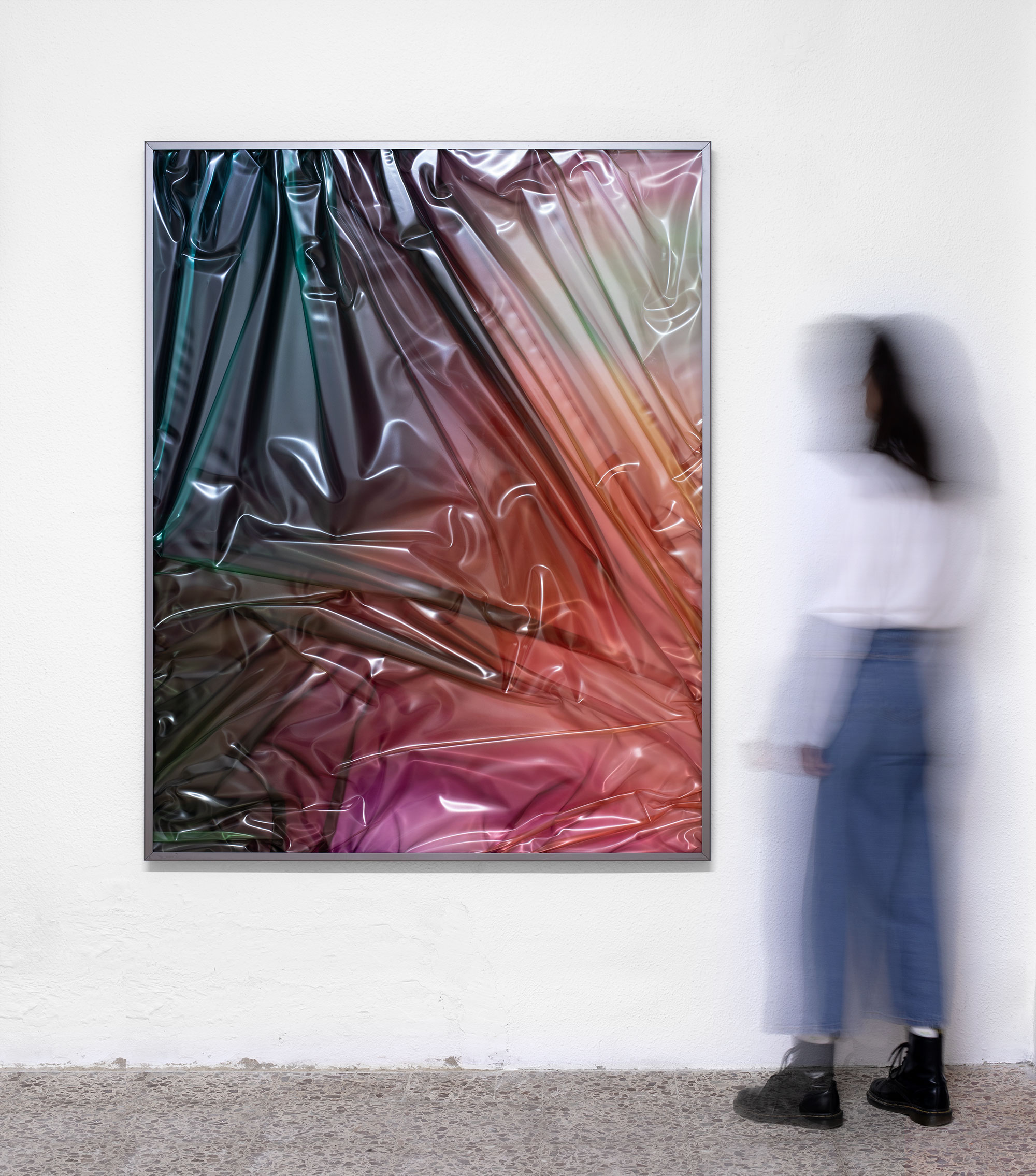 These images are transformed, moving away from their original digital form and appearance, as they adapt to a change in scale and acquire a physical materiality. Version uses this process as a metaphor, employing the direct manipulation of printed images on flexible surfaces. The images are manually deformed, acquiring a three-dimensional quality, and then flattened again onto a two-dimensional surface.